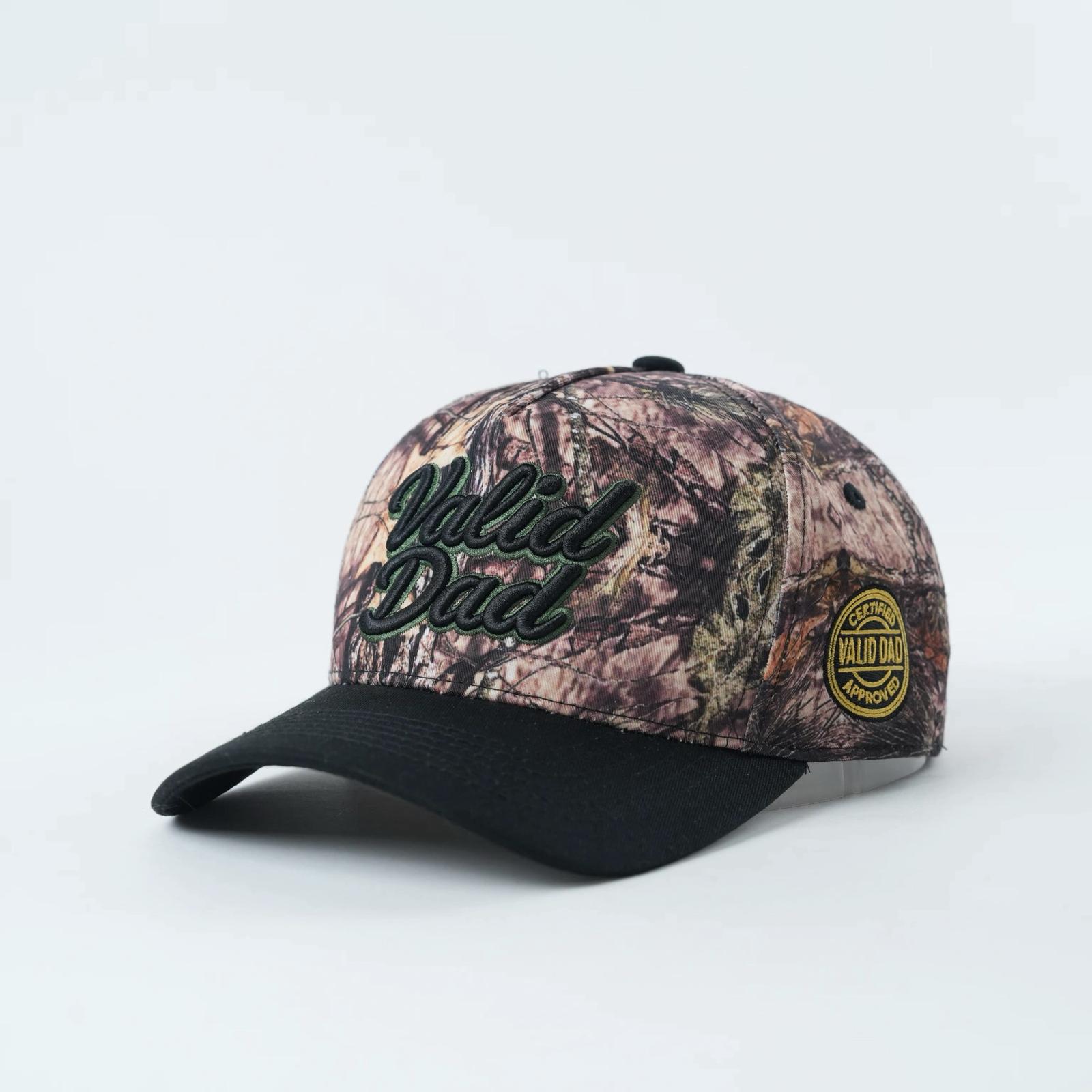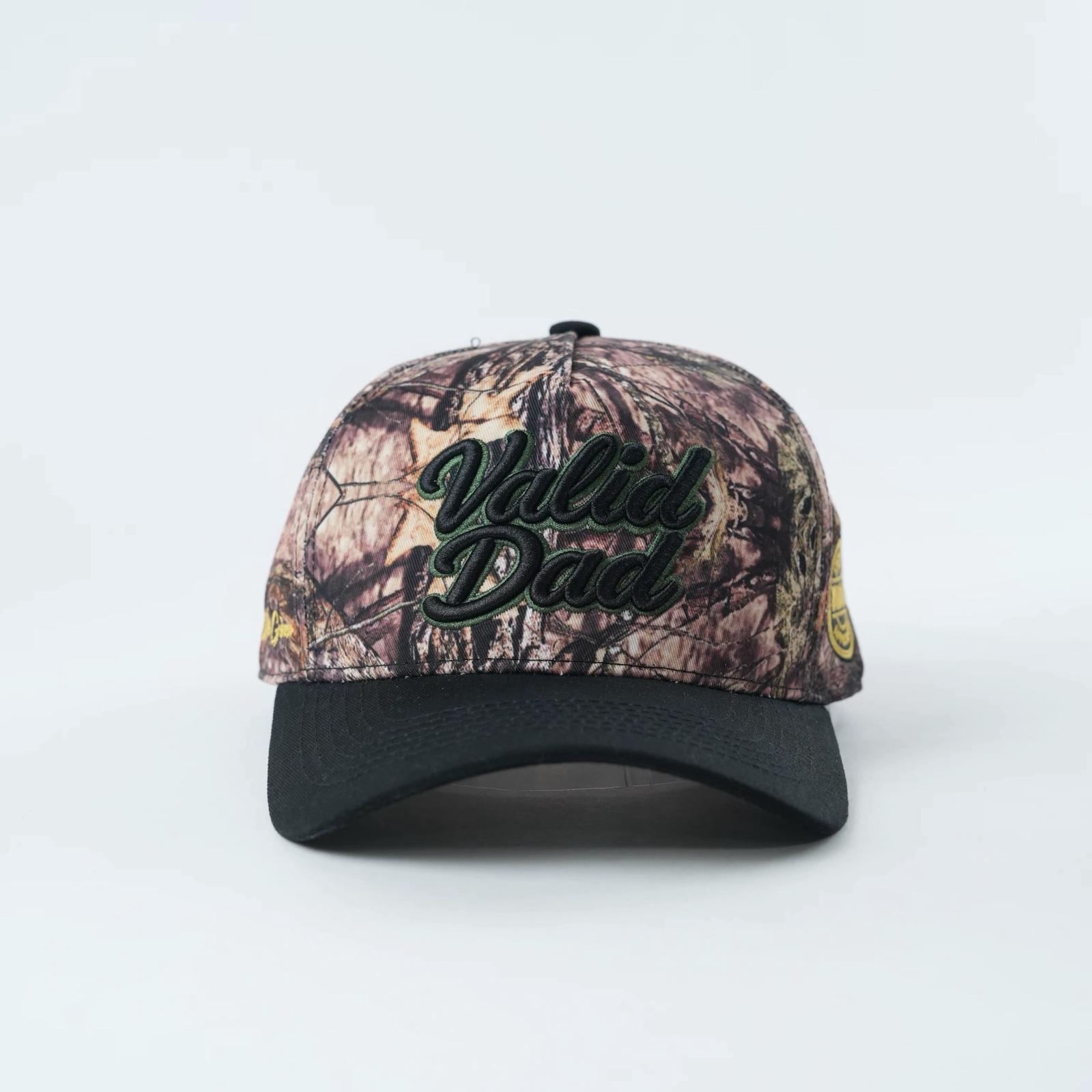 Front: "Valid Dad" 3D puff embroidery in black with dark olive green outline — rugged, rich, and built to stand out even against the most detailed print.