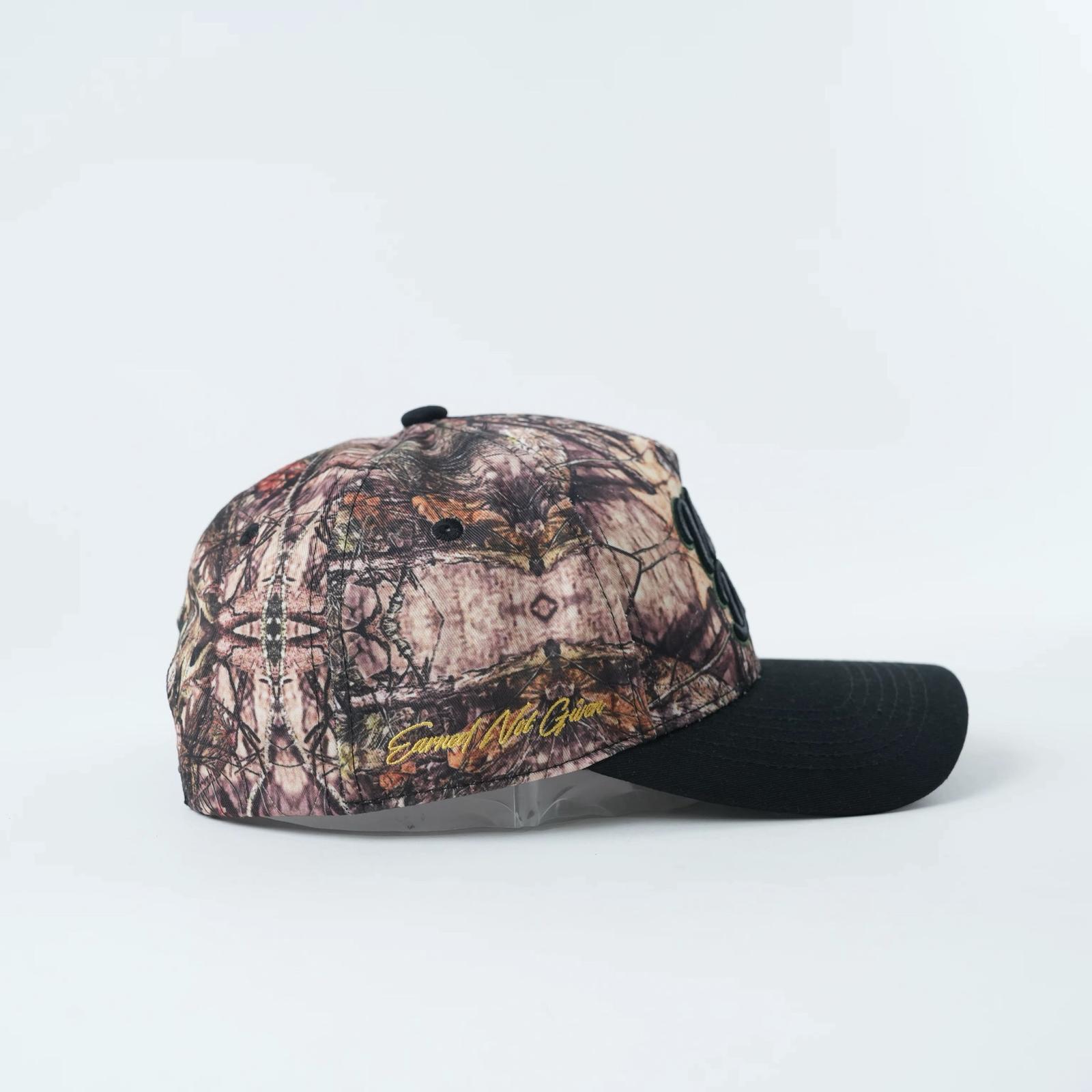 Brim: Contrasting solid black curved brim with black button top — grounding the wild print with clean structure.