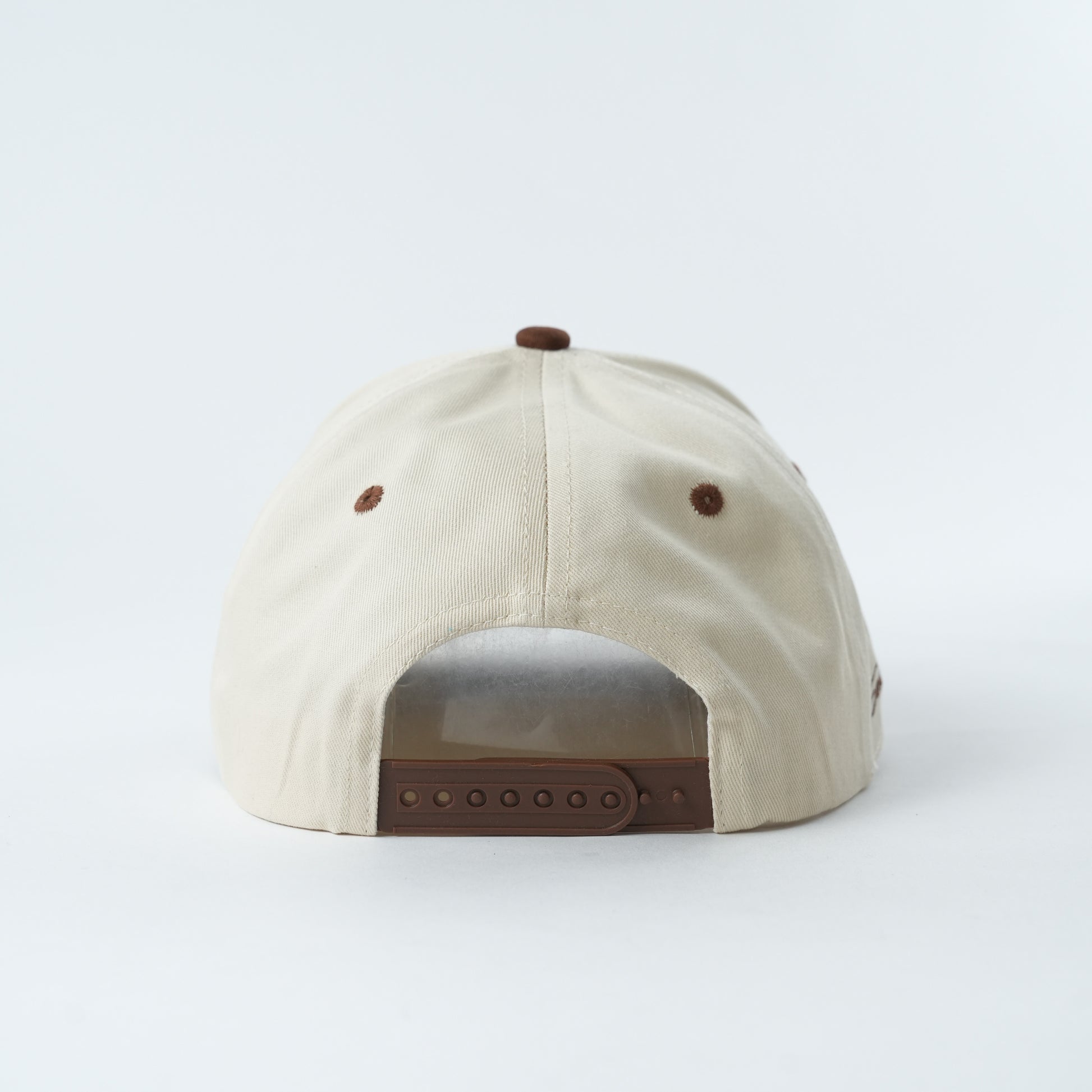 Brim: Contrasting brown curved brim with matching brown button top — a true two-tone classic.