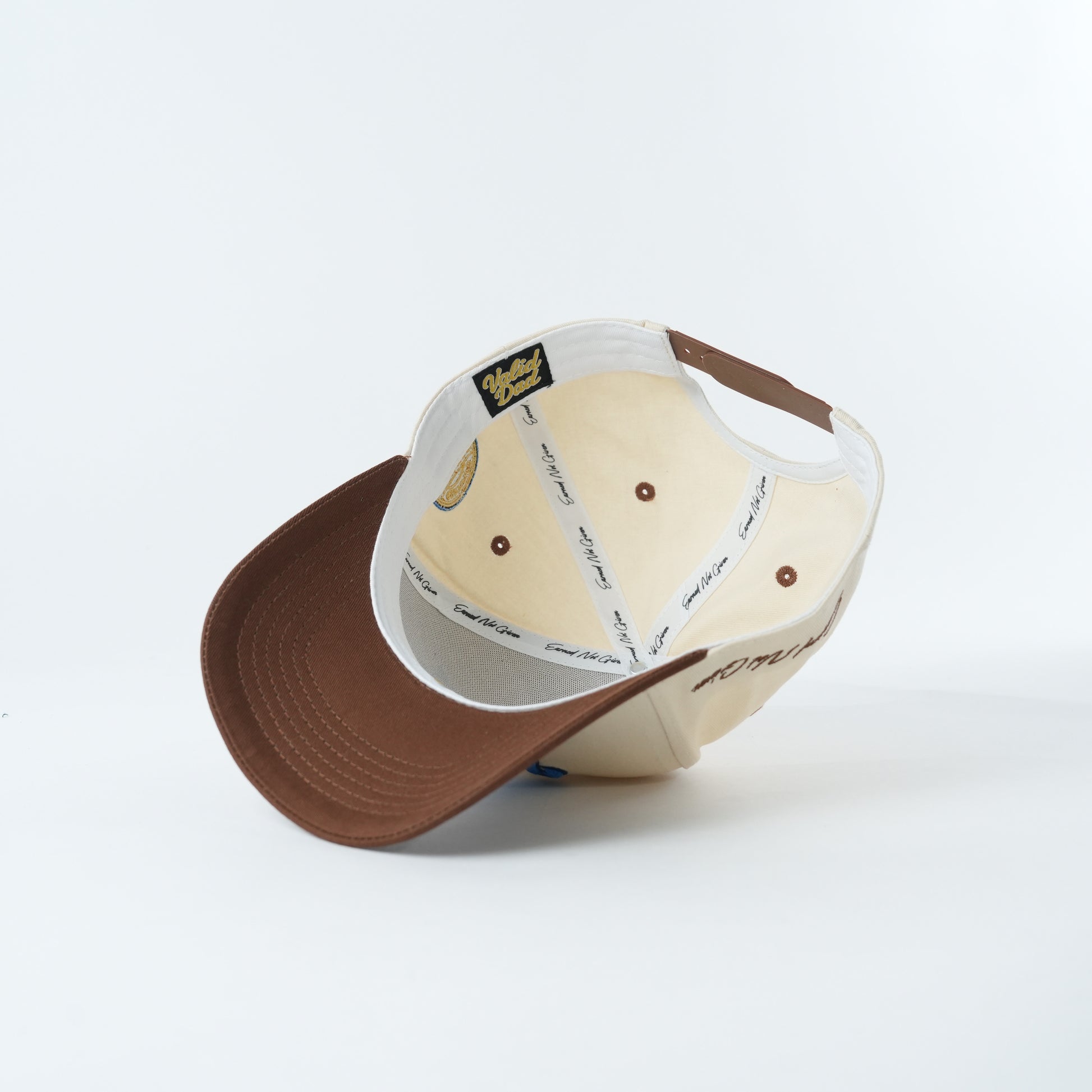 Right Side: "Earned Not Given" script embroidery in brown — the Valid Dad motto, subtle and clean.