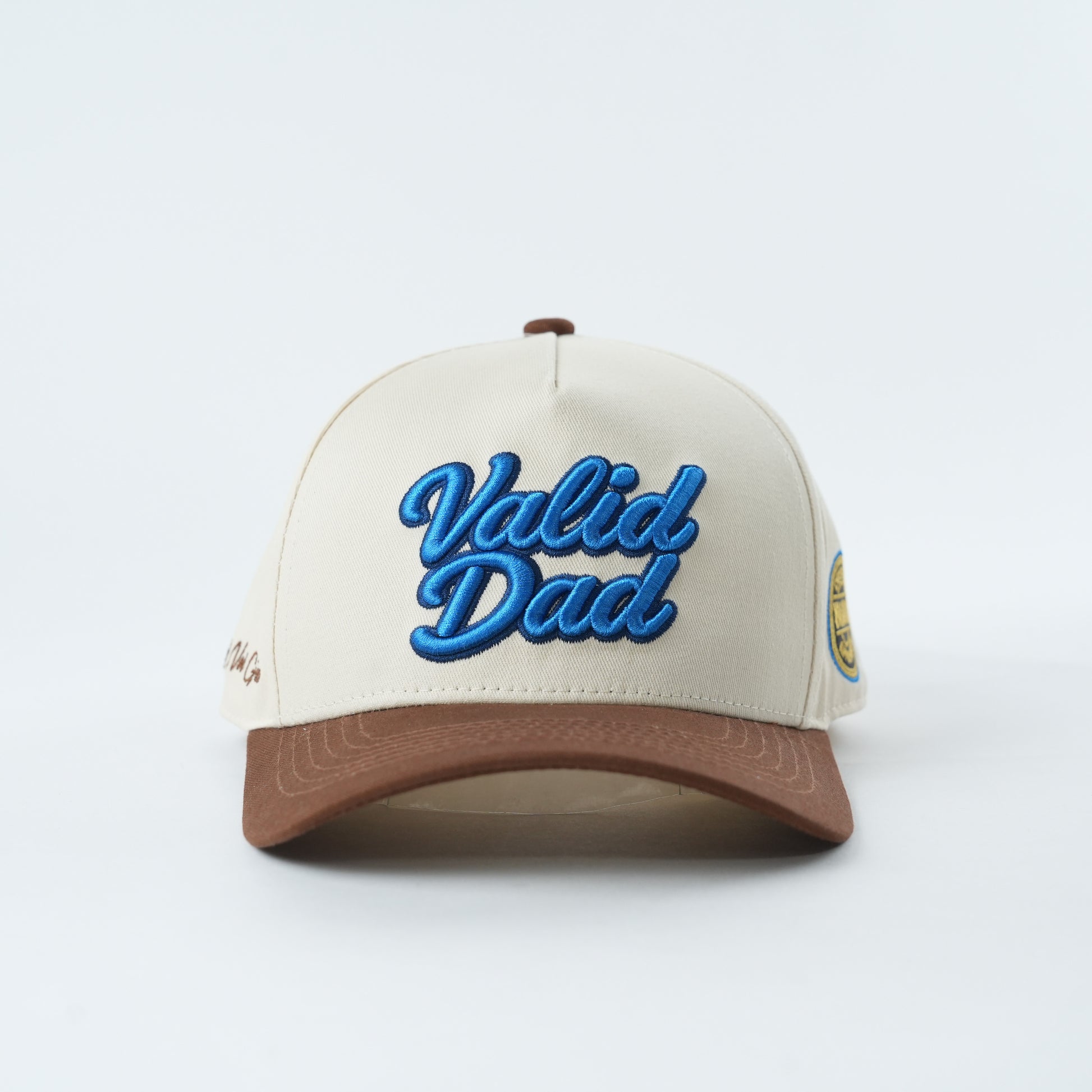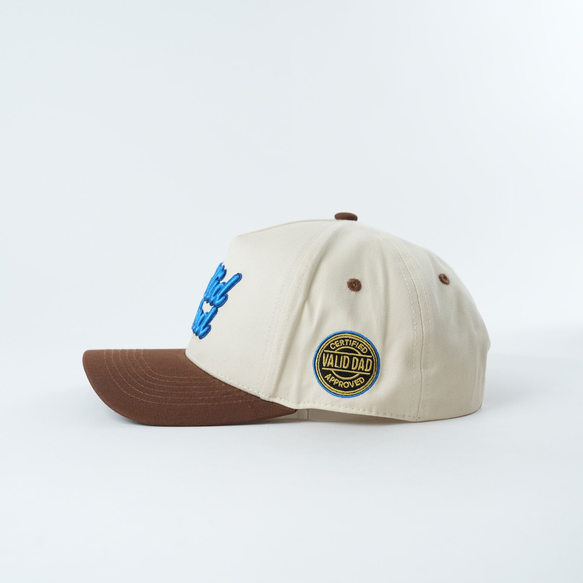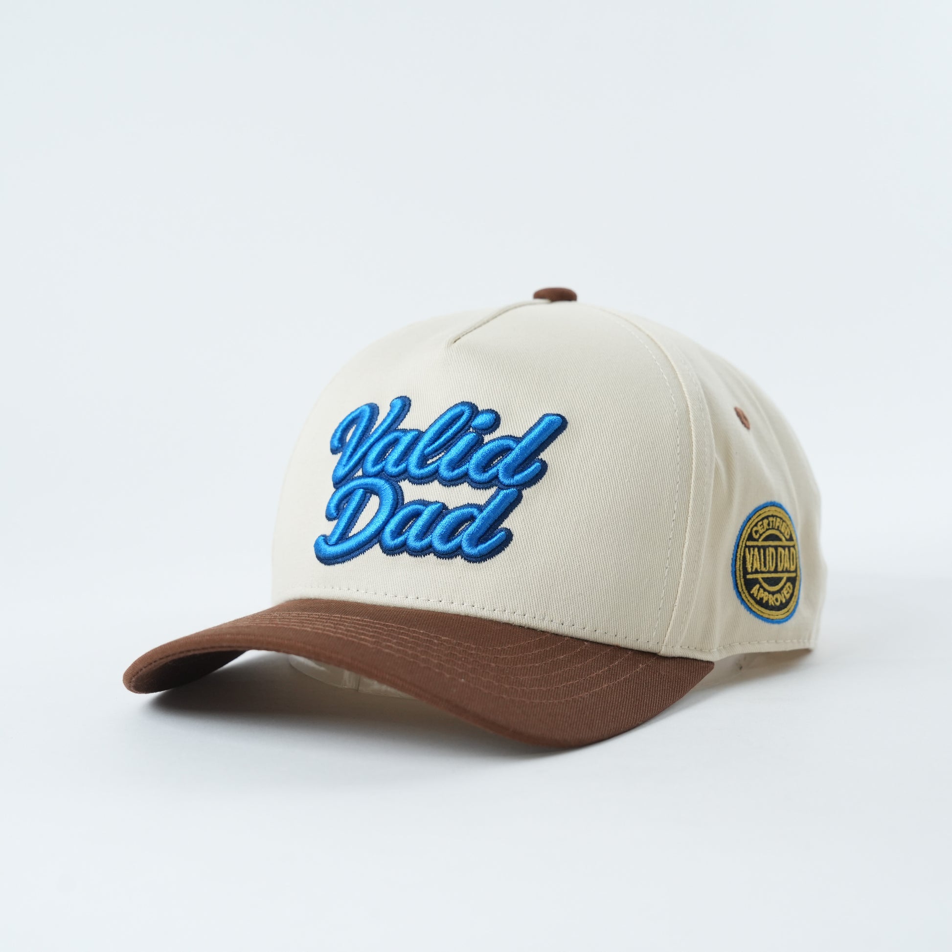 Front: Bold "Valid Dad" 3D puff embroidery in royal blue — vivid, eye-catching, and impossible to ignore against the cream canvas.